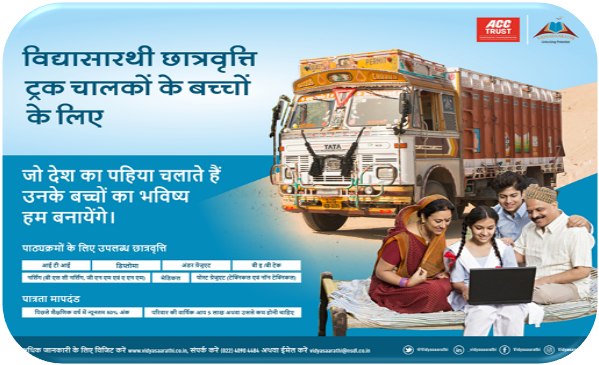 To further encourage drivers adopt safety measures, ACC TRUST, the Corporate Social Responsibility (CSR) arm of ACC Limited, has launched the “Vidyasarathi” online scholarship programme, to provide financial aid to numerous truck drivers’ children to enable higher education and help them pursue their dreams.