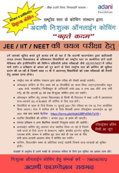 Adani Foundation in collaboration with a reputed coaching institute will start online classes for medical and engineering aspirants in Tammar area of Raigarh district in Chhattisgarh.