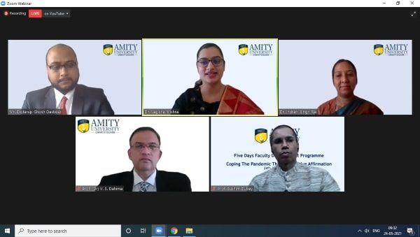 A five-day Faculty Development Program was organized by Amity University Chhattisgarh on “Coping the Pandemic through Positive Affirmation” from 24th May to 28th May 2021 on virtual mode.