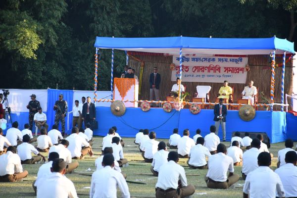 A group of Swayamsevaks demonstrated physical drill with thousands of audience attending the meeting, following which Dr Bhagwat left for Dibrugarh concluding his maiden visit to Majuli.