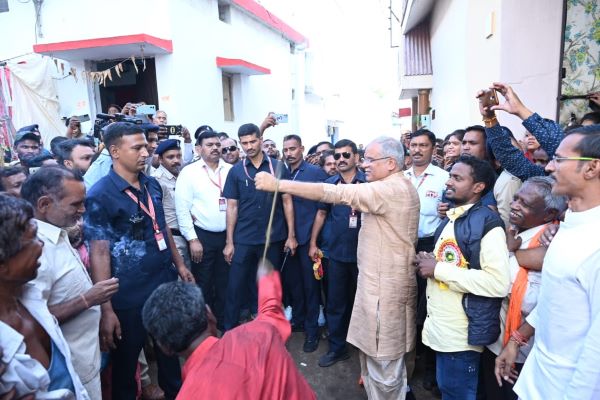 After the puja, Birendra Thakur performed the tradition and whipped the Chief Minister with sonta (whip made up of kush, a grass), who took it for the prosperity and welfare of Chhattisgarh. Earlier, elderly Bharosa Thakur used to conduct the sonta tradition and hit people with a whip as per their wish in Janjgiri. After his death, his son Birendra Thakur has been carrying forward his legacy.