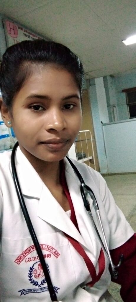 Ms. Sarita Potai hails from Akabeda in Narayanpur district. The second eldest of 7 siblings, she feels is among the lucky few to get a chance to be sponsored and adopted by BSP’s CSR department for BSc Nursing in PG college of Nursing. “I feel a sense of pride doing my duty. Having worked in the Flu clinic, and later on administering medicines and injections in the COVID ward, I’ve also learnt to deal with difficult patients,” she said. She always dreamt of working in JLN Hospital and RC and glad to be fulfiling her dream, Sarita said, adding that they learnt a lot from Senior Sisters by observing them in the hospital.