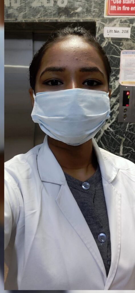 Ms. Sushma Markam, also a student of PG college of Nursing began working in JLN Hospital and RC in December 2020. She has experience of serving patients in Trauma, Surgical and Child wards. Our families were initially apprehensive about us working with COVID patients, but we have dealt with the extreme rush of COVID patients in April 2021. “We are posted on rotation for 7 days in COVID wards. Besides giving timely medications and caring for them, we also counsel patients not to be scared of higher sugar levels and ask them to take proper diet,” she added.