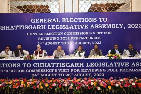 The poll panel headed by Chief Election Commissioner (CEC) Rajiv Kumar landed here on Thursday on a three-day visit to review the election preparedness in Chhattisgarh that goes to the polls probably in November. The team on Friday chaired the meeting of officials including from the districts and took stock of the arrangement made for the election. Election Commissioners Anup Chandra Pandey and Arun Goel, other ECI members and Chhattisgarh’s Chief Electoral Officer Reena Babasaheb Kangale were present in the meeting.