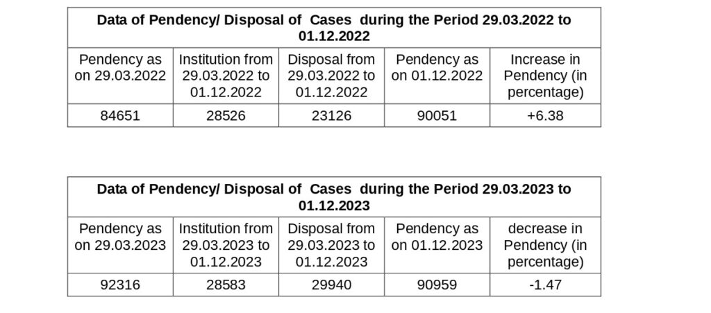 The other statistics underlined that by comparing the same periods of last year and this year, the institution of cases was 28526 (in the year 2022) and the same was 28583 during the period 29.03.2023 to 01.12.2023. Thus, the institution of cases during the same period was increased by almost 0.20 per cent, nevertheless, the disposal of cases also augmented. If compared during the identical periods, then it comes to 23126 cases and 29940 cases respectively.