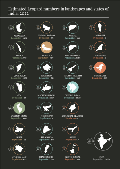 देश में तेंदुओं की सर्वाधिक संख्या मध्यप्रदेश में है – 3907 (2018: 3421), इसके बाद महाराष्ट्र (2022: 1985; 2018: 1,690), कर्नाटक (2022: 1,879; 2018: 1,783) और तमिलनाडु (2022: 1,070;2018: 868) हैं। टाइगर रिजर्व या सबसे अधिक तेंदुए की आबादी वाले स्थल- आंध्रप्रदेश के श्रीशैलम में नागार्जुन सागर और इसके बाद मध्यप्रदेश में पन्ना और सतपुड़ा हैं।