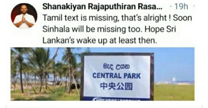 Last week, Batticaloa Parliamentarian from Tamil National Alliance (TNA) Shanakiyan Rasamanickam shared on Twitter an image of a sign board of the ‘Central Park’ coming up at the China-backed Colombo Port City, with text in Sinhala, English and Mandarin, and said: “Tamil text is missing, that’s alright! Soon Sinhala will be missing too. Hope Sri Lankans wake up at least then.”