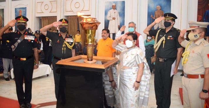 Governor Anusuiya Uikey welcomed the victory flame and said the enthusiasm and zeal with which Indian Army jawans were celebrating the “Swarnim Vijay Varsh” and carrying the victory flame, it would set a precedent and model for the present and coming generations. The family members of the warriors were honoured on the occasion.