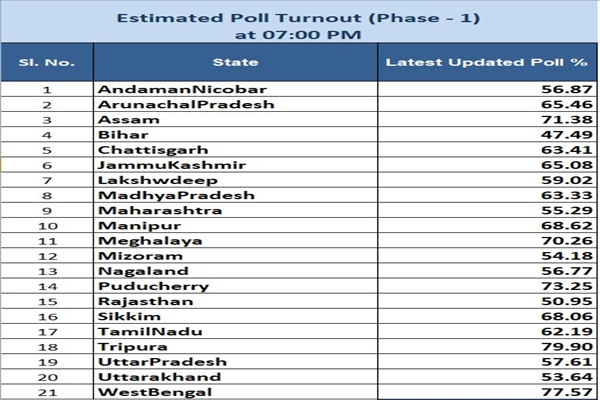 Tentative figure of voter turnout across 21 States/UTs reported is over 60% at 7 PM. State wise figures are placed at Annexure A. The voting percentage is likely to go upwards when reports from all polling stations are obtained as polling is scheduled till 6 PM in many Constituencies. Also, voters reaching the Polling stations till the end of polling hour are allowed to cast their vote. Final figures will be known tomorrow after the scrutiny of form 17A.