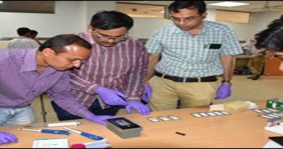 Diagnostics with Finger-Prick Blood on Paper Strip, an ultra-low-cost, rapid extreme point-of-care device can quantitatively measure plasma glucose, hemoglobin, creatinine, and lipid profile from finger-prick blood collected on a paper-strip via a smartphone-based app. Just like how a credit card interfaces with a card reader, the paper strip interfaces with a hand-held device for getting the test results. This can be used for mass screening of several non-communicable diseases at the grass root level.