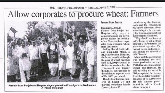 “Allow corporate(s) to procure wheat: Farmers,” the Chandigarh edition of The Tribune covered the story on April 3, 2008. The Punjab and Haryana farmers led by Bharatiya Kisan Union (BKU) protested against the then United Progressive Alliance (UPA) government’s move to ban corporate from procuring wheat from the farmers.