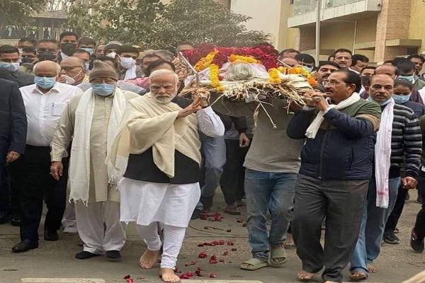 Soon after getting information, rushed to Gandhidham. He offered floral tributes to his mother there and bowed down at her feet. In an exemplary example of simplicity, the last rites were performed even as the Prime Minister participated in the entire process as a common man.