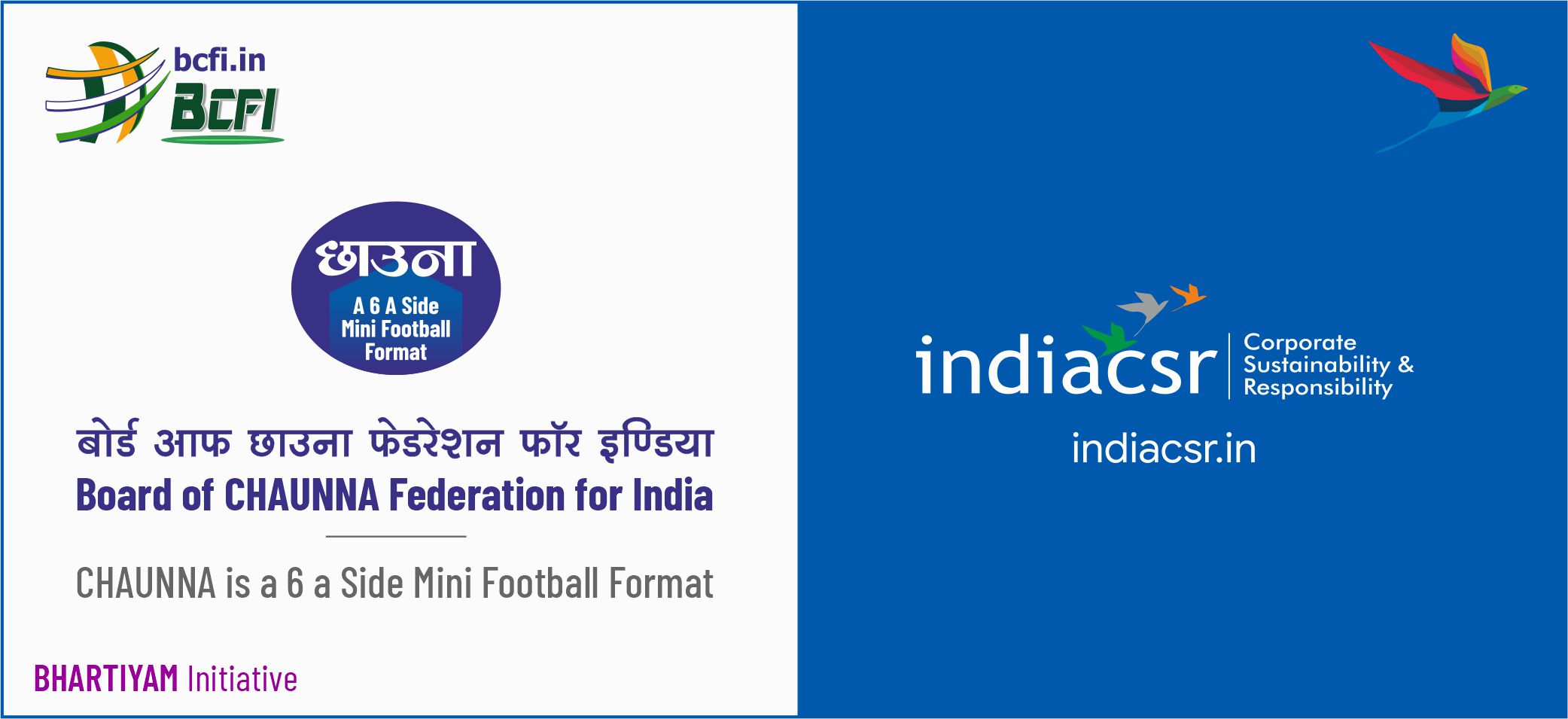 “We are proud to announce a new partnership with the Board of CHAUNNA Federation for India, an apex and governing body to develop 6 a side mini football format in India. We are committed to promote sport and games among corporate India. The partnership will also promote CSR and Sustainability among youths and students in India”, said Rusen Kumar, CEO, India CSR