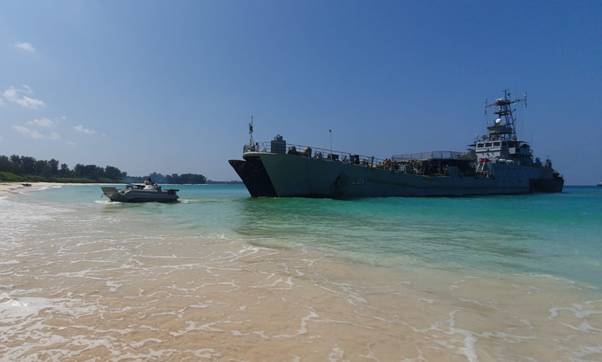 As part of shaping the battlefield, MARCOS along with their combat loads and Air Droppable Rigid Hull Inflatable Boats (ADR) were dropped over the Andaman Sea, enabling the Marine Commandos reach the target with stealth and speed. MI-17 V5 Armed Helicopters undertook precision targeting against designated enemy assets at sea and on land. The training exercise culminated with the beach landing operations by elements of Amphibious Brigade of Southern Command from INS Jalashwa, Airavat, Guldar and LCU MK-4 class of ships with 600 troops along with tanks, troop carrier vehicles and other heavy weapons.