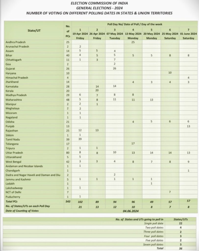 Chief Election Commissioner (CEC) Rajiv Kumar said that the elections for the 18th Lok Sabha would be held in seven phases. The elections will start on April 19 and continue till June 1. The counting will be held on June 4.