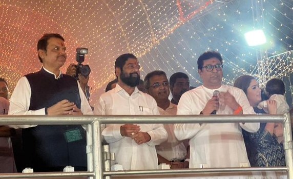 In an overt signal of a possible political realignment, Maharashtra Chief Minister Eknath Shinde and Deputy Chief Minister Devendra Fadnavis participated in a Diwali event organized by the Maharashtra Navnirman Sena (MNS) here on Friday. MNS Chief Raj Thackeray welcomed the two leaders at the `Deepotsav’ function.