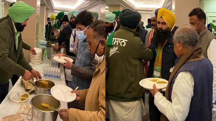 The ministers joined the farmer leaders during the lunch break at Vigyan Bhawan where the government was holding talks with farmers. Visuals came inside Vigyan Bhavan which showed ministers being served the langar, community meals that the farmers bring with them.