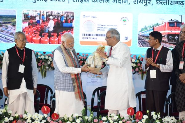Of the 10 projects included distribution of 7.5 million Ayushman health cards to the beneficiaries. As a token, the Prime Minister gave away cards to five persons. When the first card was given to Modi for handing it over to the beneficiary, the Prime Minister held the hand of Chief Minister Bhupesh Baghel standing left to him.