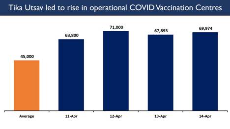 The clarion call given by the Prime Minister of observing the days between April 11 and 14 as ‘Tika Utsav’ saw many Vaccination Centres (CVCs) operational across the private and public workplaces. On an average 45,000 CVCs used to be functional on any given day. On Day-1, Day-2, Day-3 and Day-4 of the four day “Tika Utsav”, 63,800, 71,000, 67,893 and 69,974 CVCs were active, respectively.