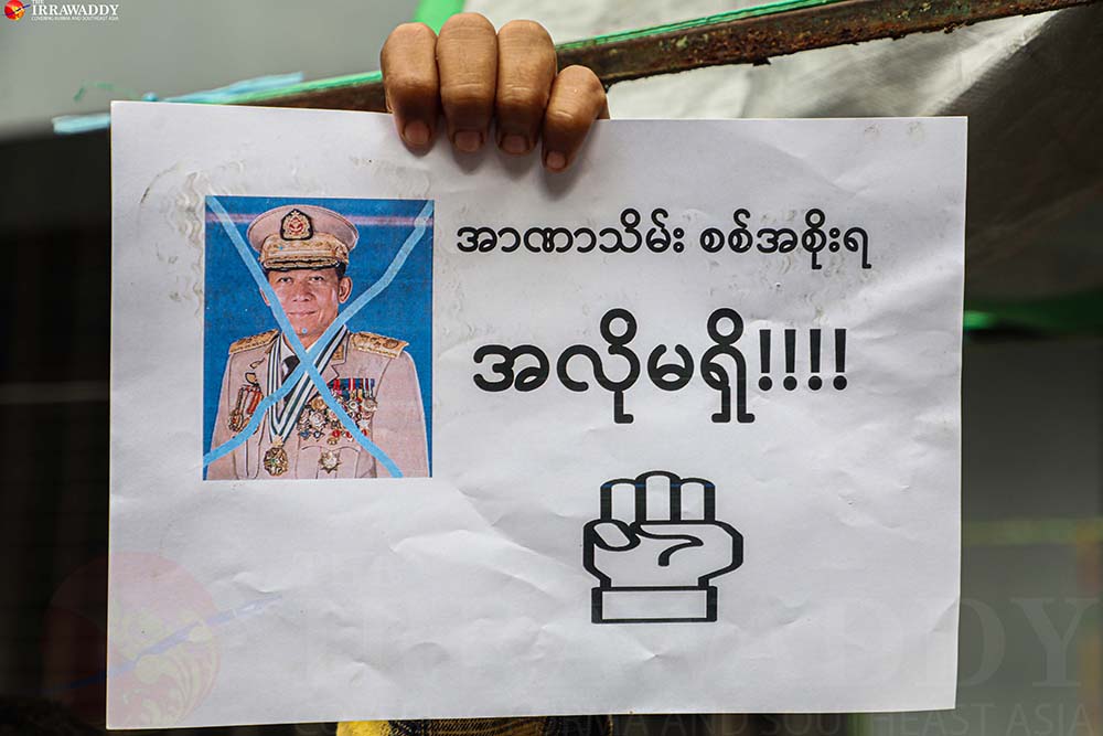 Since Saturday, the city has resounded with chanted slogans such as “Down With Military Dictatorship!” as protest columns marched down to Hledan and downtown from other parts of the city. They waved the flags of Daw Aung San Suu Kyi’s National League for Democracy (NLD) and student unions, and shouted “Good Health to Mother Suu” (referring to Daw Aung San Suu Kyi) through their facemasks—COVID-19 remains a threat in the country—while raising three fingers in a defiant salute borrowed from the “Hunger Games” films. Bystanders returned the salutes. Drivers honked their car horns to show their support for the protesters and their opposition to the coup.