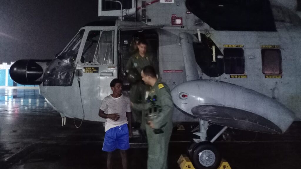Subsequently, a Seaking 42C helicopter with suitable Night Vision Devices was launched to undertake the rescue mission at about 11 PM. Despite the similar rainy weather and strong winds the Seaking helicopter undertook search and located the survivor. The helicopter hovered over the survivor in the River Suvarnamukhi at a very low altitude to pick up the survivor. The aircraft returned to INS Dega wherein First Aid was provided and the survivor was later shifted to KGH for further Medical treatment. His family members were informed of his wellbeing by the Naval Air Station.