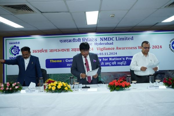 The event commenced with Amitava Mukherjee, CMD (Addl. Charge), NMDC, administering the Integrity Pledge at NMDC HO in Hyderabad. He was joined by Vinay Kumar, Director (Technical) and (Personnel, Addl. Charge), NMDC and B Vishwanath, Chief Vigilance Officer, NMDC, along with senior management and employees, who actively participated in the solemn ceremony.