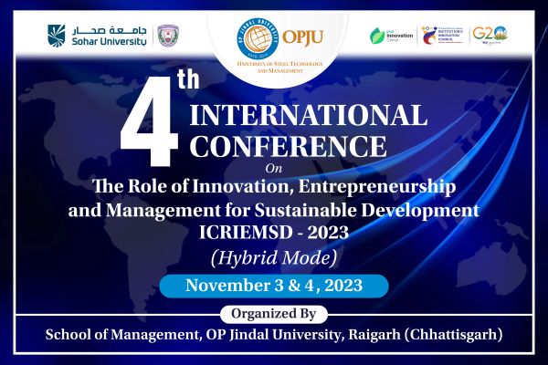 OP Jindal University, Raigarh’s School of Management is organising a two-day 4th International Conference on ‘Role of Innovation, Entrepreneurship and Management for Sustainable Development’ during 3 – 4 November 2023.