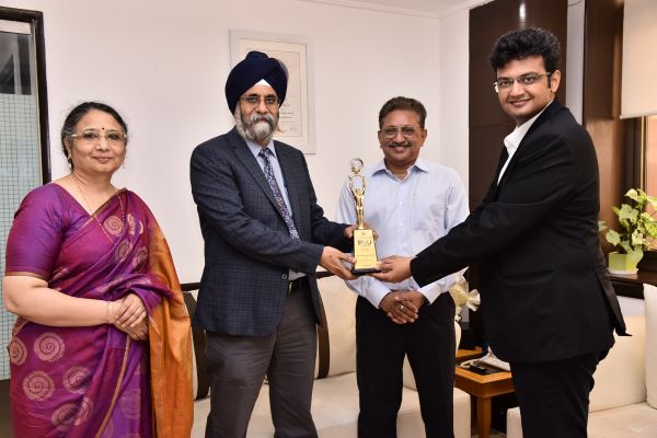 Kailashnath Adhikari, MD, Governance Now presented the Award to Ravinder Singh Dhillon, CMD, PFC in presence of P K Singh, Director (Commercial) and Projects (Additional Charge) and Smt. Parminder Chopra, Director (Finance).