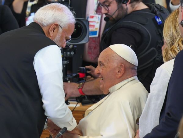 Prime Minister Narendra Modi and Pope Francis met with a warm embrace at the Outreach session of the G7 Summit in Apulia, southern Italy.