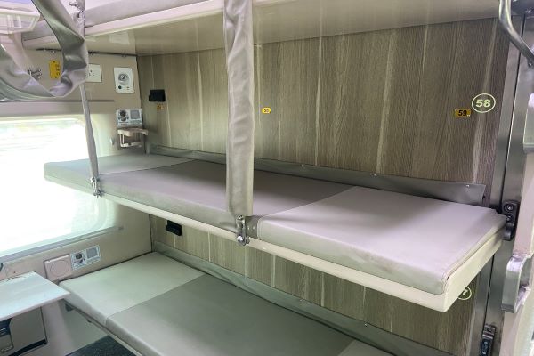 Improved passenger conveniences have been ensured in form of foldable snack tables in both longitudinal and transverse bays, injury free spaces and holders for water bottles, mobile phone. Individual reading lights and USB charging points are provided for each berth. A new ergonomically improved design of ladder for accessing the middle and upper berths has been provided too. There is an increased headroom in the middle and upper berths.