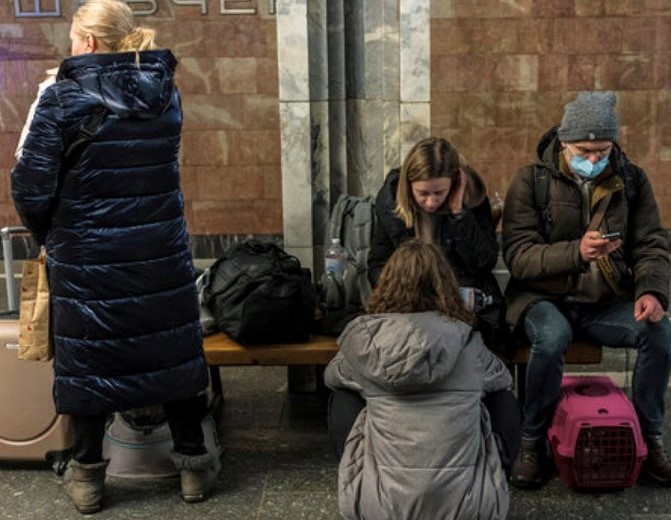 Kyiv residents huddled inside a metro station, which serves as a bomb shelter, after air raid sirens sounded early on Thursday morning. Several cities in Ukraine were under attack as Russia began its invasion from land and sea.