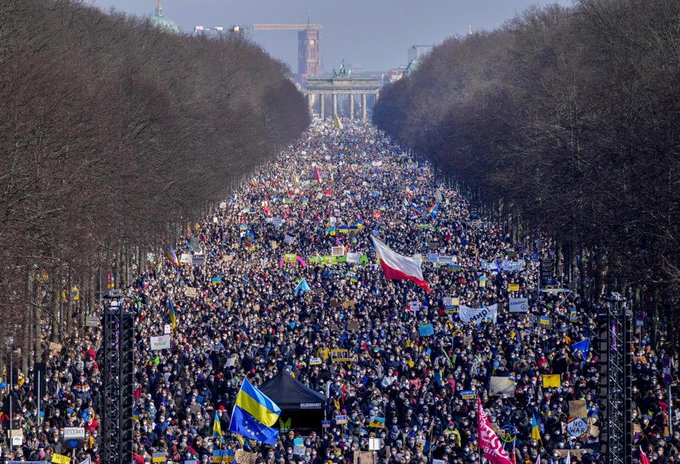 यूक्रेन पर रूस के आक्रमण का विरोध करने और यूक्रेन के लोगों के साथ एकजुटता दिखाने के लिए लगभग 100,000 लोग बर्लिन में विरोध करने निकले हैं।