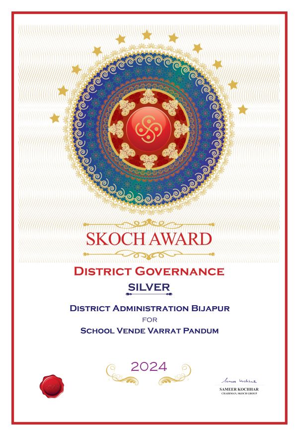 The district administration of Bijapur in Chhattisgarh has bagged Skoch silver award for the School Vende Varrat Pandum project that meant going to school again in local dialect. The award has been given in the category of good governance.