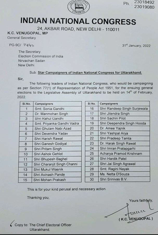 The list of 30 leaders also included the names of Congress chief Sonia Gandhi, former PM Manmohan Singh, Rahul Gandhi and Priyanka Gandhi Vadra, as well as Ghulam Nabi Azad, Sachin Pilot, Chhattisgarh Chief Minister Bhupesh Baghel, Randeep Surjewala, Hardik Patel and Ragini Nayak.