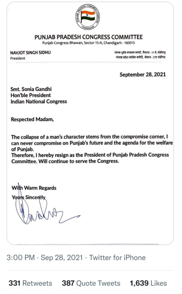 उन्होंने कांग्रेस अध्यक्ष सोनिया गांधी को संबोधित करते हुए अपना इस्तीफा ट्विटर पर डाला है। सिद्धू ने कांग्रेस अध्यक्ष सोनिया गांधी को लिखे अपने पत्र में कहा, “एक आदमी के चरित्र का पतन समझौता कोने से होता है, मैं पंजाब के भविष्य और पंजाब के कल्याण के एजेंडे से कभी समझौता नहीं कर सकता।”