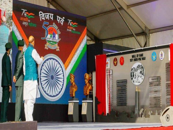 The event marks the culmination of year-long celebrations of 50 years of India’s victory in the war. Rajnath Singh began his address by paying rich tributes to the country’s first Chief of Defence Staff General Bipin Rawat who passed away in a helicopter crash in Tamil Nadu on December 08, 2021. “In the untimely death of General Rawat, India has lost a brave soldier, an able advisor and a lively person. He was looking forward to taking part in the Swarnim Vijay Parv,” he said.