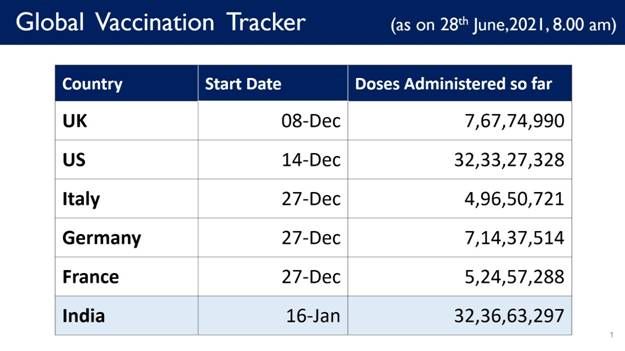 कोविड-19 टीकाकरण अभियान में भारत ने एक और मील का पत्थर पूरा कर लिया। इस सिलसिले में भारत ने ज्यादा से ज्यादा टीके लगाने में अमेरिका को पीछे छोड़ दिया है। भारत का कोविड टीकाकरण अभियान 16 जनवरी, 2021 को शुरू हुआ था, जबकि अमेरिका ने अपने यहां यह अभियान 14 दिसंबर, 2020 को ही शुरू कर दिया था।