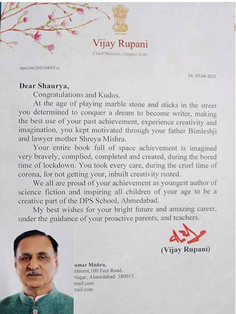 Rupani as Chief Minister congratulated Law Kuamr Mishra’s grandson Shaurya Mishra, a student of Delhi Public School, Ahmedabad